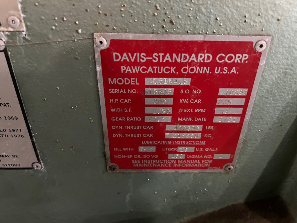 4.5" Davis Standard Thermatic III gearbox Model 4.5IN4.5 Serial Number I5805 Year of Manufacture 2001 Shop Order # 70892, HP cap 290, S.F 1.50, Gear Ratio 22.5, RPM 78